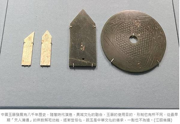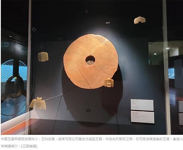 中國玉器早期因為預料少,玉料珍貴,經常可見以天圓地方造型玉器,作為向天祭祀之用,也可見鳥禽意象的玉器,象徵人神溝通媒介。(江昭倫攝)