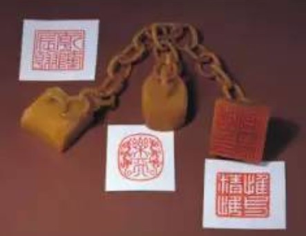 乾隆帝田黃三聯璽,左“乾隆宸翰”,正方形,高1cm,邊長2.6cm;中“樂天”,橢圓形,高1cm,長徑3cm,短徑2.3cm;右“惟精惟一”,正方形,高1cm,邊長2.6cm。此聯璽是清高宗乾隆皇帝做太上皇時所鐫。係由一塊相當大的田黃石雕刻而成。三方印鏈連在一起。璽文“惟精惟一”、“樂天”皆出於儒家經典。以“惟精惟一”為文之璽在乾隆早期即有多方,常與“奉三無私”、“乾隆宸翰”一同使用。“惟精惟一”出自《尚書·大禹漠》:“人心惟危,道心惟微,惟精惟一,允執厥中。”即危則難安,微則難明,故戒以精一,信執其中。乾隆以此表明其施政思想。“樂天”之義取自《周易·繫辭》:“樂天知命,故不憂。”義即“順天施化是歡樂於天,識物始終是自知性命,順天道之常數,知性命之始終,自然之理,故不憂也。”此三聯璽在乾隆帝上千方的小璽中備受青睞,以後各帝亦十分珍視。清末代宣統皇帝溥儀被逐出宮時攜出此印,且隨身不離,至1950年方將其交出,經有關機構移交北京故宮博物院收藏。