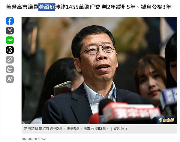 藍營高市議員黃紹庭涉詐1455萬助理費 判2年緩刑5年、褫奪公權3年 - 政治 - 自由時報電子報
