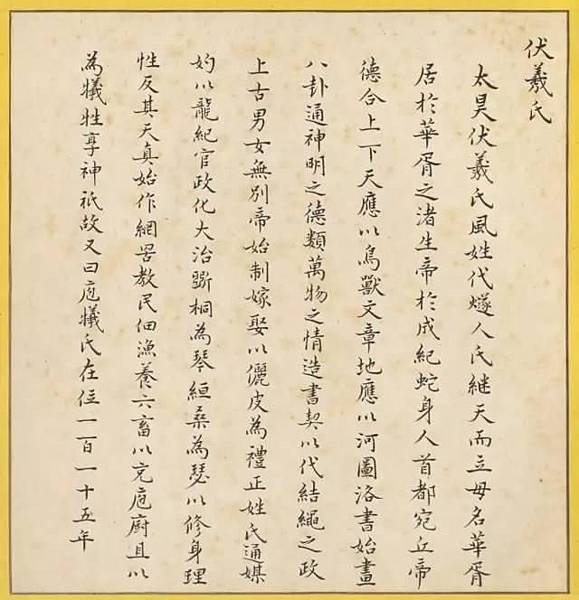 西晉時期皇甫謐的《帝王世紀》曾記載了這樣的一個故事:「太昊帝庖犧氏,風姓也。燧人之世,有巨人跡出於雷澤,華胥以足履之,有娠生伏羲於成紀,蛇身人首,有聖德。」東晉-王嘉《拾遺記》說:「春皇者,庖犧之別號。所都之國有華胥之州,神母游其上,有青虹繞神母,久而方滅,即覺有娠,歷十二年而生庖犧。」