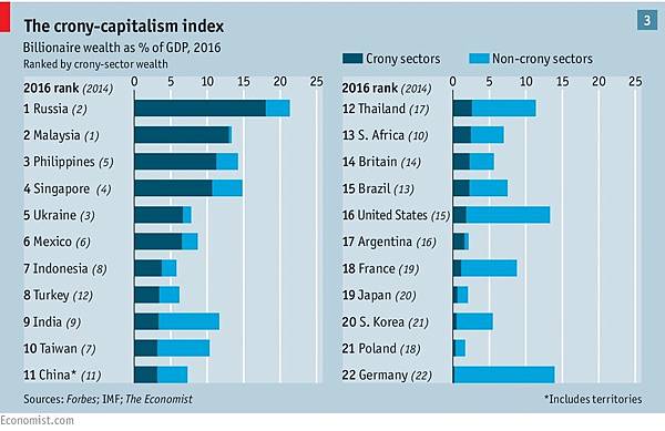 〈經濟學人〉(The Economist)藉由分析該國富豪從與政府相互密切的行業中所賺到的財富占該國GDP的比值,在近日公布了一份2016年親信資本主義指數(Crony Capitalism Index)的研究報告,以我們常聽到的用語來說,就是裙帶資本主義在該國的發展程度指標,一個國家如果裙帶資本主義其為昌盛,就代表了該國的商業發展極為依賴於政府官員間的關係,你如果關係越好,越能夠賺到錢,這正是國人最為厭惡的官商勾結的一種類型。