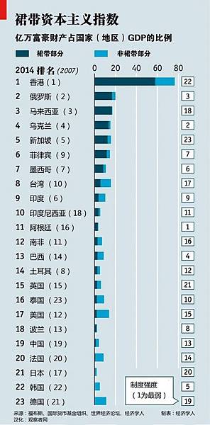 香港的裙帶資本主義指數遠遠高於其他國家和地區,富豪財富佔GDP的比重接近60%,遠遠拋離第二位俄羅斯的18%。新加坡(5)、台灣(8)、印度(10)等新興經濟體均排在高位,中國則排第19。