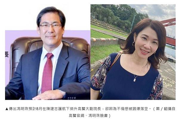 捲不倫戀風波,升副院長機會「啪!沒了」。高雄醫學大學董座陳建志爆婚內出軌小港醫院副院長馮明珠長達20年,兩人甚至共築愛巢,出席公開活動「牽牢牢」成了公開的秘密;時機點巧合,傳出馮明珠預計8月在陳建志護航下將榮升高醫大副院長,卻因為不倫戀被踢爆而落空;教育部昨(7)日派6名專員南下調查,內容還驚見馮明珠疑似挪用計畫經費7500萬元買名牌包、化妝品。黑料連環爆,疑似為了避風頭,馮明珠緊急關閉臉書。