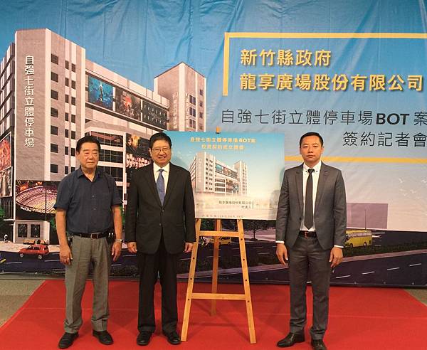 今天上午新竹縣長楊文科與龍享廣場股份有限公司董事林煌盛於新竹縣政府大廳,正式簽定「竹北市自強七街立體停車場BOT案」興建營運契約。記者郭政芬/攝影