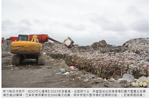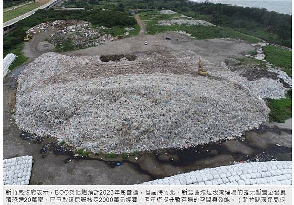 [記者廖雪茹/新竹報導]新竹縣政府環保局表示,「新竹縣促進民間參與高效能垃圾熱處理設施投資BOO案」預計2023年底營運,但新竹市焚化廠延役計畫工程期間可能將停收垃圾,使得竹北、新豐區域垃圾掩埋場的露天暫置垃圾累積恐達20萬噸,縣府已爭取環保署核定2000萬元經費,明年將提升暫存場的空間與效能。
