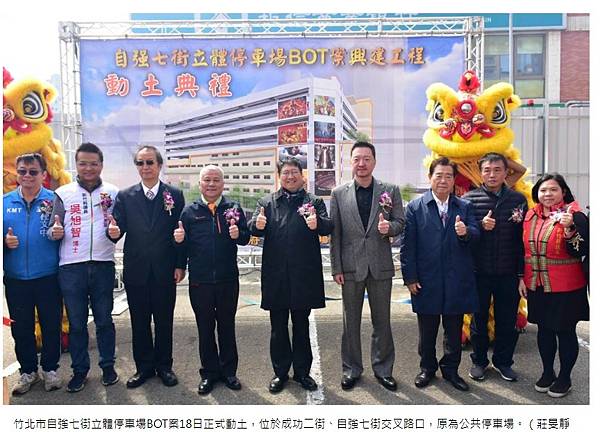「竹北市自強七街立體停車場BOT案」興建投資額達12億多元,特許年限為50年,明年年初動工,預計3年完工。楊文科縣長表禦,竹縣招商屢有佳績,他前陣子也至台北接受財政部「招商卓越獎」第一名的獎項,BOT為政府、企業、民間三方創造三贏的一種興建公共工程方式,能提振經濟、帶動周邊產業創新升級、創造就業機會,未來也將推出停18停車場用地BOT案。