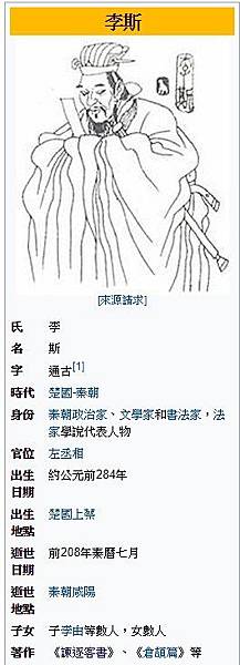 李斯(前284年-前208年)[2]。楚國上蔡(今河南省上蔡縣西南方)人,是秦朝著名的政治家、文學家和書法家。李斯曾任秦朝左丞相,司馬遷著《史記》,將李斯和趙高併寫於《李斯列傳》。