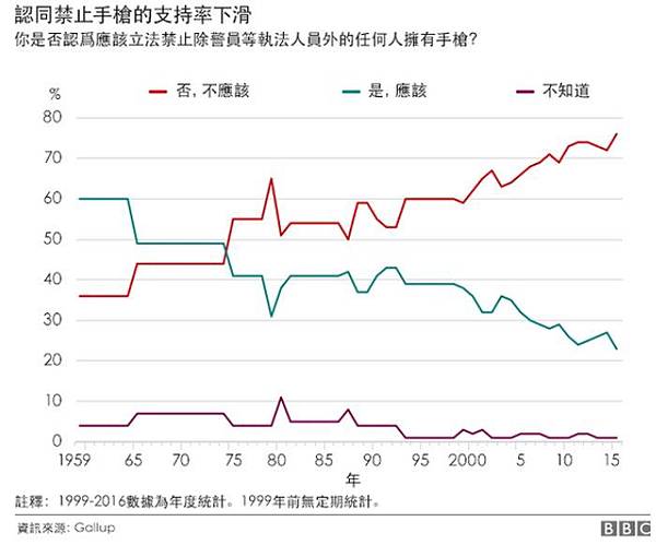 美國民眾對槍枝管制的態度在過去60年內有戲劇化的轉變。這份資料不夠完備,但能看出支持度的轉變。現在大多數人反對禁止手槍。