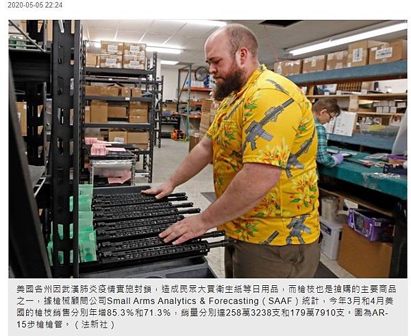 《福斯商業新聞網》(Fox Business News)報導,據SAAF在4日發布的數據,美國民眾在疫情下大舉搶購槍支,其中民眾購買的槍枝產品多為手槍,另外還包括長管槍械。