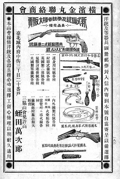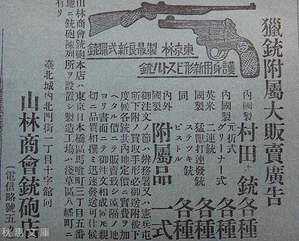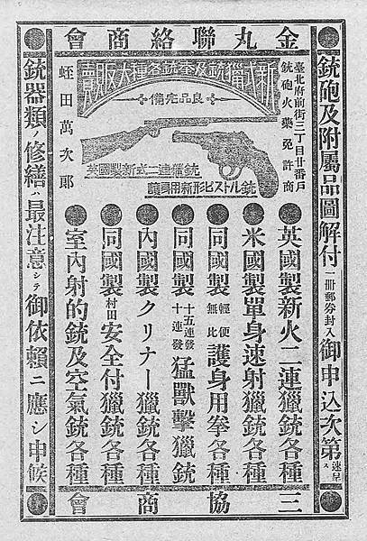 日本時代1901年臺北槍械廣告,除了有槍枝的圖案還有一些周邊用品。