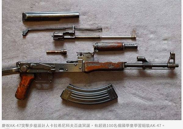 俄羅斯昨天慶祝AK-47突擊步槍設計人卡拉希尼科夫(MikhailKalashnikov)100歲冥誕,昨日有超過100名俄國學童在莫斯科一處公園學習組裝AK-47。