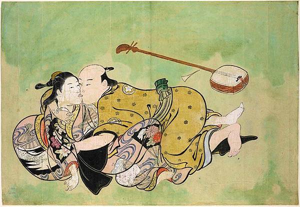 引誘年輕女子的男人,後面放著一把三味線(日本三弦琴)。手工染色的木版畫,背景為綠色。波士頓美術館也有同樣的木版畫,但沒有著色