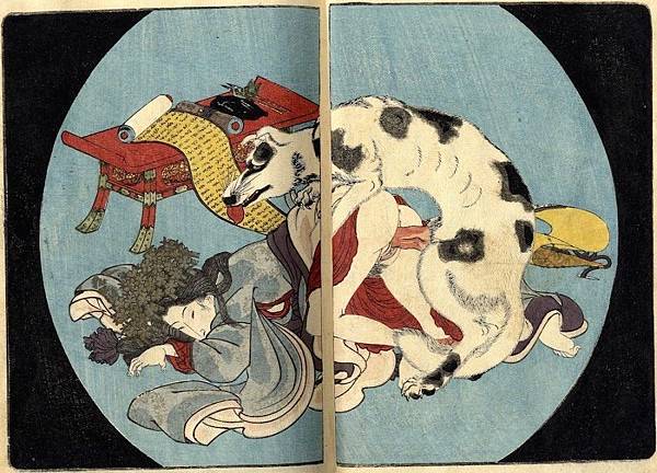 另一方面,在很多作品中你還可以看到,或是極端地誇張了生殖器,或是刻畫了一些荒誕不經富於幽默的場景,很難說它們是性愛行為的寫實表現。這就是春畫又被稱為「笑繪」的緣由。比如,活躍於幕府末期至明治時代的浮世繪畫師河鍋曉齋(1831-1889),他在明治初期創作的版畫作品就是一例。他從背面描畫了兩個激情相擁的男女,但在畫面前方,你可以看到一隻小貓正俏皮地向男子的生殖器伸出尖爪……。接下來會發生什麼,觀眾是很容易想像的。