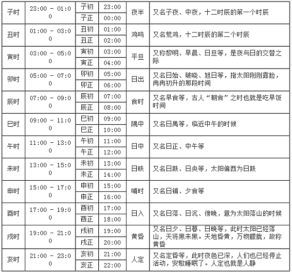 漢代皇宮中值班人員分五個班次,按時更換,叫“五更”,由此便把一夜分為五更,每更為一個時辰。戌時為一更,亥時為二更,子時為三更,丑時為四更,寅時為五更,其對應如下: