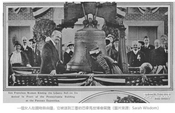 一個女人在親吻自由鍾,它被送到三番的巴拿馬世博會展覽(圖片來源:Sarah Wisdom)