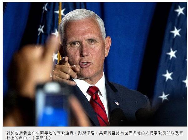 對於包括發生在中國等地的宗教迫害,彭斯保證,美國將堅持為世界各地的人們爭取良知以及宗教上的自由。(歐新社)