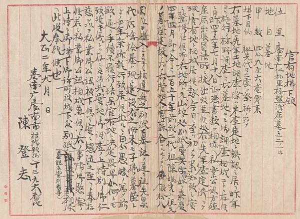 由於陳家未及時完成土地豋記,以致祖墳地在明治45年(1911)總督府進行林野調查時被收歸官有。為取回祖墳地,陳家曾向總督府提出「官有地拂下願」請求購回土地,但未獲總督府許可。其後,因關帝廟支廳缺乏收購建築學校用地的經費機緣下,陳家趁此向廳長松木茂俊提出購買新豐里新埔庄(今臺南市關廟區新埔里)及關帝廟街(今臺南市關廟區)土地各一筆與支廳交換,以取回祖墳地。這項提議經廳長松木向上呈報後,竟然獲得總督府許可,最後雙方完成交換登記。本件突顯出殖民統治初期政權妥協性一面,當遭遇特殊事態時,國有地也可適時成為籌碼。而陳家「趁虛而入」,提出解決地方政府的財困方案,成功取回了在官方實施林野調查之際,遭收歸國有的祖墳地,小老百姓也能夠和政府進行條件交換,是難得一見的案例。