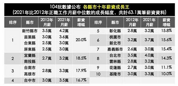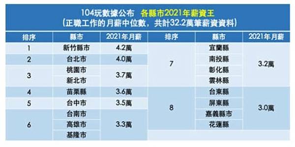 104玩數據分析10年來台灣本島19個縣市、共計365萬筆正職工作月薪中位數,產出「2021年薪資王」、「10年薪資成長王」等榜單。「2021年薪資王」排行中,第一名為新竹縣市的月薪中位數4.2萬元,第二則為台北市的4萬元,並列第三的桃園市、新北市月薪則為3.7萬元,苗栗縣3.6萬第四,台中市3.5萬位居第五。調查指出,薪資高的北桃竹主要為金融服務業、半導體、資通訊、製造業、軟體服務業之重鎮。