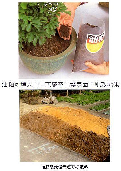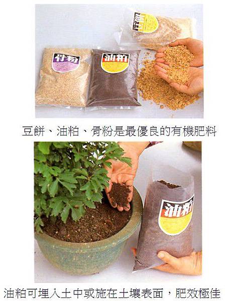 油粕:製油廠榨油後的油渣,如胡麻油粕、花生油粕、菜仔油粕、亞麻仁油粕等,分解緩慢,肥效持久。可埋入土中或施在土壤表面當置肥,肥效極佳,專業常用。