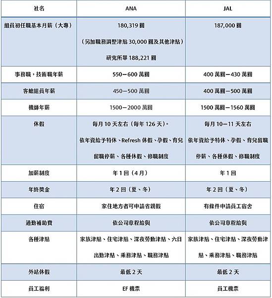ANA與JAL薪資福利比較