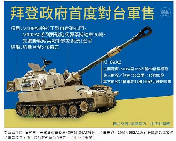拜登政府首次對台軍售 美國售台40門M109A6自走砲 | 政治 | 重點新聞 | 中央社 CNA