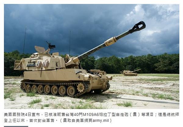 國防部證實,美國政府在美東時間8月4日針對「M109A6自走砲」等7.5億美元對臺軍售案,進行「知會國會」的程序,如果順利,將在1個月後正式生效。這也是美國總統拜登上任後,首次對台軍售。