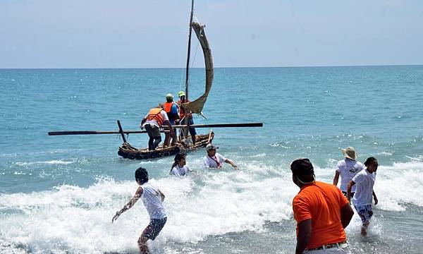 今天專程到台東紀錄試航的中央研究院歷史語言研究所研究員劉益昌表示,台東的史前文化和菲律賓北部的史前文化相當類似,在菲律賓發現的陶器比台灣晚一點,且發現台灣玉,菲律賓是沒有產玉,因此人是從台灣到呂宋島北部,但究竟怎麼去呢?「很清楚應該就是航海」。