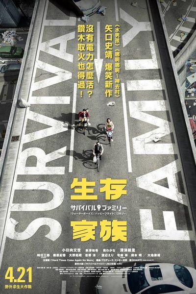 《生存家族》是名副其實的日本公路電影,一家四口為了生存而踏上單車之旅,雖然爆笑程度遠不及《小太陽的願望》、是枝裕和的暖心《奇蹟》,就連無理失控的暴民、為了求生而不擇手段ㄑ人性,也沒有日本活屍電影《請叫我英雄》來得令人義憤填膺。乍看是一部輕鬆逗趣的喜劇,卻連瘋狂和奇幻都沾不上邊,日綜《黃金傳說》的一個月一萬元節約生活、無人島0元生活,都比本片還來得不可思議。然而,這便凸顯出《生存家族》的軟調溫情敘事、不投以說教的色彩,兩者之間與真實現實如此貼近的程度。雖然其核心雖然仍圍繞在日式傳統的親情戲碼,但是都市中變成原始人的求生設定,或許也是一部能當作校園教材,在公路類型中加入愛地球的環保意識。