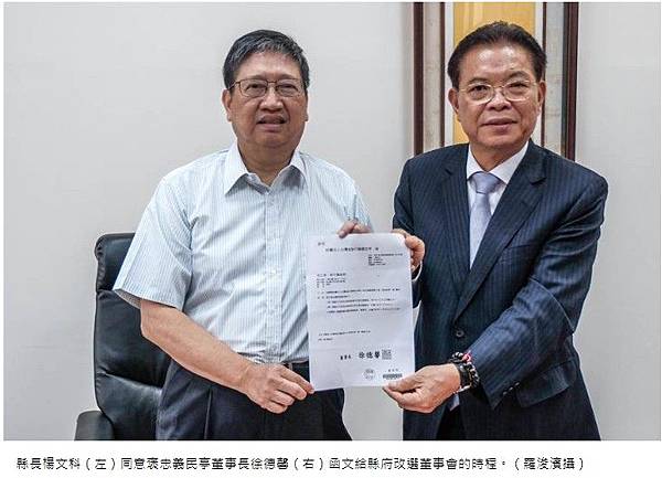 縣長楊文科(左)同意褒忠義民亭董事長徐德馨(右)函文給縣府改選董事會的時程。(羅浚濱攝)