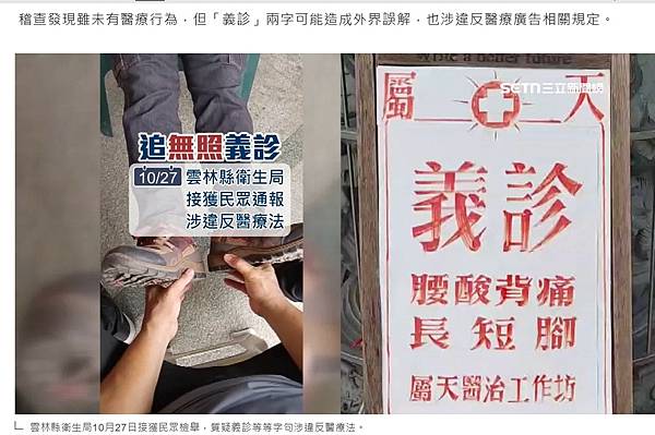 廟前放置的「義診」招牌卻踩到紅線,雲林縣衛生局10月27日接獲民眾檢舉,質疑觸法;隔天稽查發現雖未有醫療行為,但「義診」兩字可能造成外界誤解,也涉違反醫療廣告相關規定獨家/刪掉義診敏感字眼改成「體驗神蹟公益活動」,但衛生局之後仍會約談他,還可能開罰5到25萬 https://bit.ly/49DEcEJ