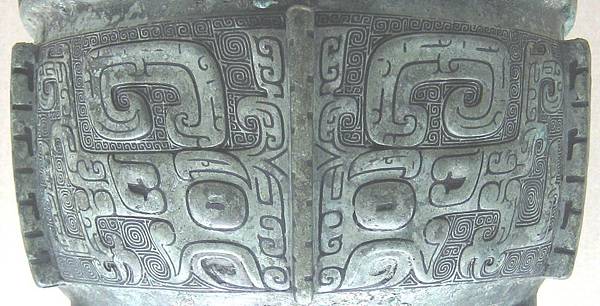饕餮紋是青銅器上常見的紋飾之一,盛行於商代至西周早、中期。古人融合了自然界各種猛獸的特徵,同時加以自己的想像而形成的,其中獸的面部巨大而誇張,裝飾性很強,也被稱為獸面紋。饕餮紋有的有軀幹、獸足,有的僅作獸面。