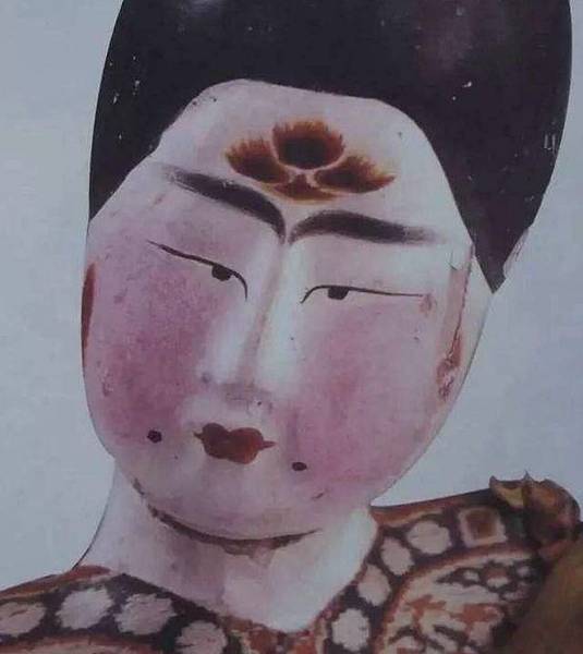 《中華古今注》裡說,「秦始皇好神仙,常令宮人梳仙髻,貼五色花子。」再往前,戰國時期楚墓中出土的彩繪女俑臉上已經有裝飾性的圓點了,所以說花鈿的歷史可以追溯到戰國時期。
