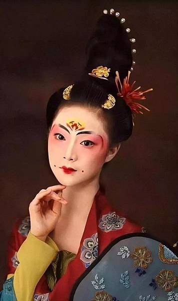 另外一個常見的裝飾部位是在太陽穴位置,叫斜紅或者曉霞妝。