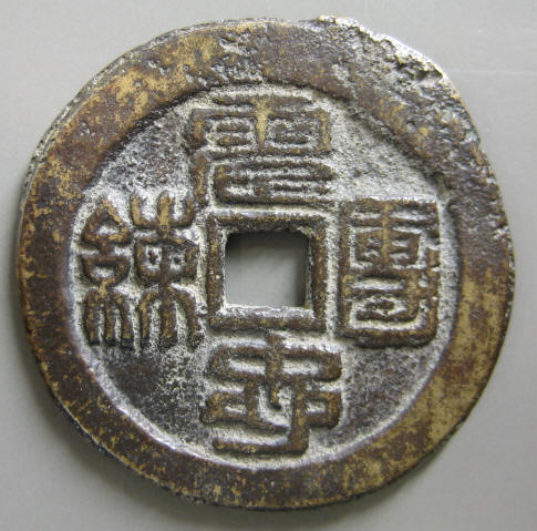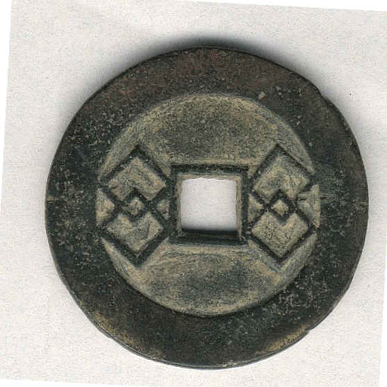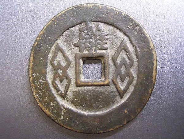另一品(圖3、圖4),是我在1999年用一方裝在牛角盒裡的老象牙圖章換得。該錢有些來頭,相比前幣可稱得上稀少,奈於自己眼力所限,也未深入研究,所以一直非常慎重不敢確定其為真品。在此只對該品做個介紹,不妄斷真偽。此品大小直徑3.7厘米,厚0.1厘米,有傳世之像,鑄制精美。幣面楷書與前幣相同,錢文清晰,線條較前幣稍細,豎橫撇捺乾淨利落,書味雋永,頗具神韻,可稱漂亮。背左右方勝,穿上「天」字。幣身包漿渾然,滑熟可鑑,面含幽光。