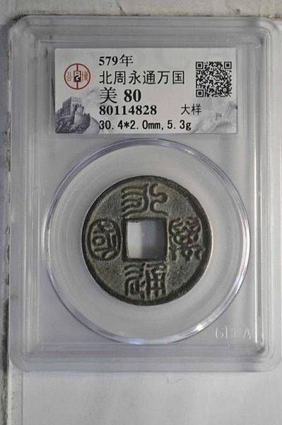 北周靜帝宇文闡,大象元年(公元579年)始鑄。面文「永通萬國」,玉箸篆,
