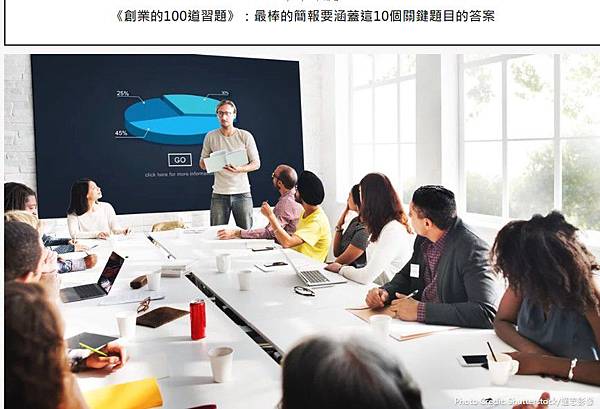 準備簡報與相關資料,是讓你後退一步檢視營運計畫,尤其是商業模式的大好時機。一份好的簡報,關鍵在於能否詳實舉證說明你的能耐。把這當作你澄清願景目標的機會,你的簡報要清楚易懂,引人入勝,全面又扼要,理想形式是以不超過十五到二十張投影片,清楚點出你這家新創公司的核心。大體而言,內容應該涵蓋十個關鍵題目的答案,當然,那要針對你這家公司的特性來裁剪: