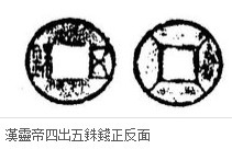 於中平三年 公元186年,靈帝又令開鑄新的「五銖」錢,為有別於庫中所貯「五銖」錢,他別出心裁,將新的「五銖」錢背鑄出四道斜紋,此紋由穿孔的四角直達外郭,世稱「四出五銖」 見圖。所鑄的「四出五銖」比一般「東漢五銖」鑄造得要好,錢的重量也要重一些。它的直徑為2.5厘米,穿徑約8毫米,廓厚0.15厘米,重3.6克左右。