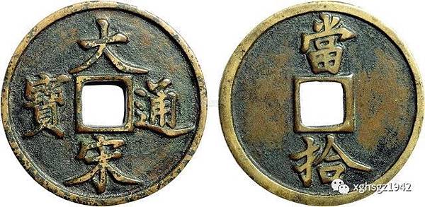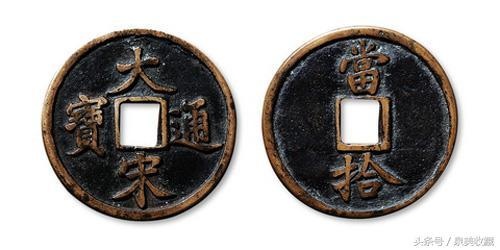 大宋通寶當十大錢為南宋理宗寶慶元年(1225)七月後所鑄。當時行“大宋元寶”錢,而“大宋通寶”只有鐵質小平錢。銅質者僅見背“當拾”大錢一種。製作精整,傳世絕少。“當拾”大錢徑一寸六分(5.2厘米),重30至35克不等。錢文楷書直讀,書法秀麗,拾字從入,是其特徵。據云出自宋代大書法家蔡京手筆。按錢