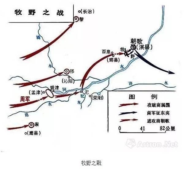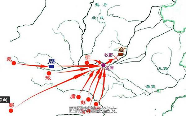 白話:那是甲子日(武王十一年或者十三年二月五日)凌晨,武王(率大軍)來到了商都附近的牧野,於是(在此)誓師。武王左手持黃鉞,右手舉白旄指揮大軍。(大聲)說:「遠征辛苦,來自西方的戰士們!」