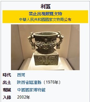 利簋,西周早期青銅器。為周武王時官吏利所作,故名。因其銘文中有「珷征商」字樣,又被稱為「武王征商簋」。1976年出土於陝西臨潼縣(今西安市臨潼區),現藏中國國家博物館。2002年入選禁止出國(境)展覽文物名錄。