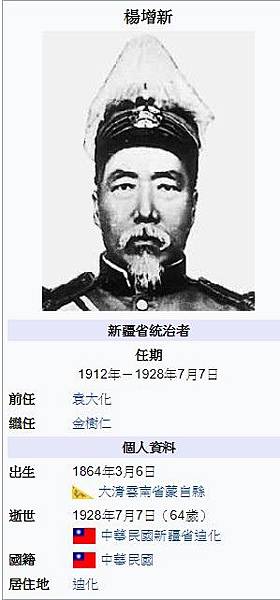 楊增新(1864年3月6日-1928年7月7日),字鼎臣,雲南蒙自人[1],清末民初政治人物,光緒進士。中華民國初年曾主政新疆達十七年,歷任新疆都督、督理新疆軍務、新疆督軍、督辦新疆軍務善後、新疆省主席等職銜。[2]