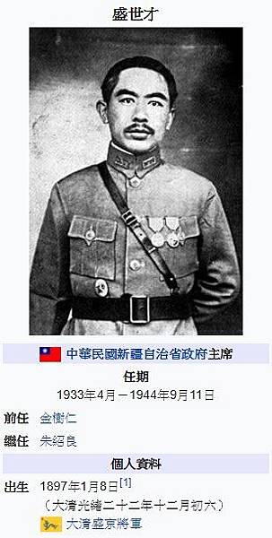 盛世才(1897年1月8日-1970年7月13日),字晉庸,漢軍鑲黃旗人[2],中華民國陸軍將領,遼寧省開原盛家屯村人[3],中華民國新疆省政府主席,1933年至1944年間新疆軍事、政治首長,有「新疆王」之稱。盛世才早年為奉系軍人,後投靠新疆軍閥金樹仁,屢立戰功,1933年新疆發生兵變,陳中、白受之、鄭潤成、巴品古特等人驅逐金樹仁,盛世才乘機取得大位。盛世才治下的新疆,雖未宣布獨立,但完全脫離中華民國國民政府的控制,那一時期的新疆,拒絕懸掛國民政府的青天白日滿地紅旗,而是懸掛盛氏政權的「六角星旗」。1941年1月,盛世才曾向蘇聯提議:成立突厥斯坦蘇維埃社會主義共和國,脫離中華民國,加盟蘇聯。鑑於當時中蘇的同盟關係,史達林拒絕這一提議。1943年,盛世才加入中國國民黨,並表示「矢志擁護中央,盡忠黨國,絕對服從領袖」。隨後,盛世才取消六大政策,六角星旗亦換為中國國民黨的青天白日旗[4]。但此後因國民政府主席蔣中正對新疆用兵,盛世才開始採取對策,準備把中國國民黨勢力逐出新疆。為尋找退路,盛世才企圖再次投靠蘇聯。他致電史達林,要求重新加入蘇聯共產黨和將新疆劃為蘇聯的一個加盟共和國,但此時的蘇聯共產黨與史達林已經對盛世才徹底失望,拒絕他的要求,並把其電報轉給蔣介石。此時的盛世才,已是眾叛親離,怨聲載道。蔣介石決定把盛世才調離新疆,另任農林部長,由朱紹良代理新疆省主席。1944年9月11日,盛世才離開新疆到重慶赴任。至此,盛世才在新疆歷時11年5個月的軍閥統治宣告結束[5]。