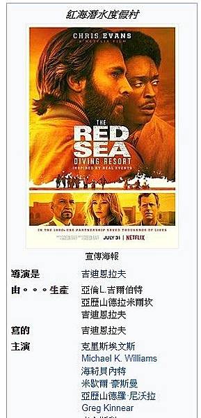 《紅海深潛/紅海潛水俱樂部/The Red Sea Diving Resort》「美國隊長」克里斯伊凡(Chris Evans)將前進蘇丹,執行難民救援任務。改編自偉大的真實救援任務,故事描述一群國際特工探員和勇敢的埃塞俄比亞人合作,在 80 年代初期透過蘇丹一個廢棄的度假勝地,將上千名難民暗渡至以色列。這個執行任務的臥底團隊是由深具魅力的艾裡·奇德隆(Chris Evans 飾)和英勇的當地人卡貝德·彬若(Michael Kenneth Williams 飾)帶領。