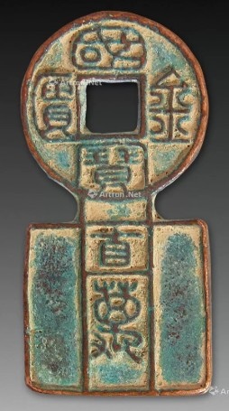 新朝王莽時期所鑄錢幣,字體優美、鑄工精良、造型別緻,如大泉五十、一刀平五千等都是珍品;其中有一款神秘的錢幣,造型奇特,上呈方孔圓形,書“國寶金匱”四字,下呈長條方形,書“直萬”二字,被古錢幣投資收藏者稱“國寶金匱直萬”,價值無可估量。被古錢幣投資收藏者稱“國寶金匱直萬”,價值無可估量。