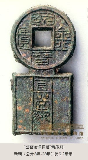 我國歷史上面值最大的銅幣,當推新朝王莽發行的“國寶金匱直萬”,面值抵頂一萬枚五銖錢。在當時,萬枚五銖錢,可兌換黃金一市斤,而一枚“國寶金匱直萬”錢,竟值一斤黃金,可見其剝削程度之驚人。也有人認為該物並非貨幣,而是藏金櫃上的拉手或者裝飾之類,象徵著王莽擁金無數。事與願違,事實上,王莽幣制改革卻加劇了新莽政權的快速滅亡。