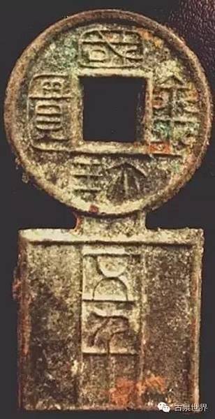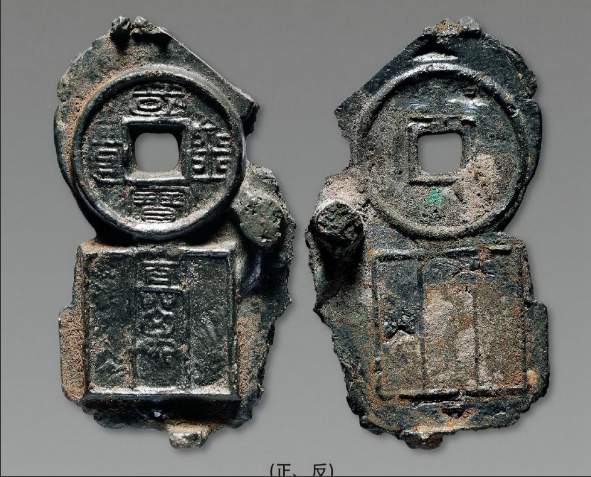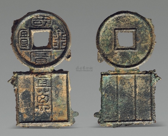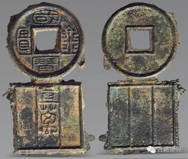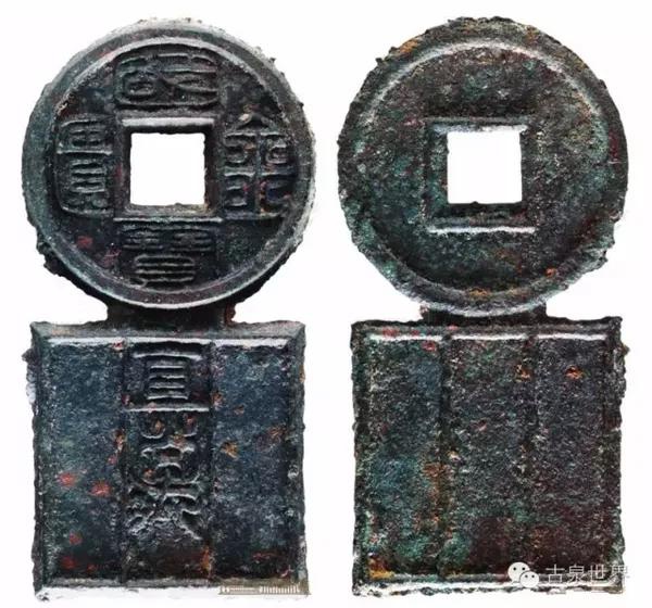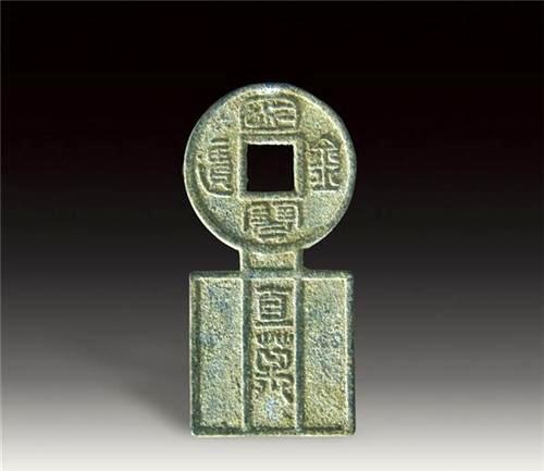 這是一種造型非常奇特的錢幣,上半部為一方孔圓錢,鑄出“國寶金匱”四字,下半部為一正方體,鑄出“直萬”二字。錢緣流銅參差不齊,顯然出型後尚未經過打磨加工,可能未正式流通,所以僅在今陝西西安漢城一帶出土過數枚。該錢重41.7克,約合62銖,面值卻相當於一萬枚“五銖”青銅錢。這種錢幣就是大家所熟知的“國寶金匱直萬”青銅錢,是新朝王莽瘋狂的貨幣改革的歷史見證。