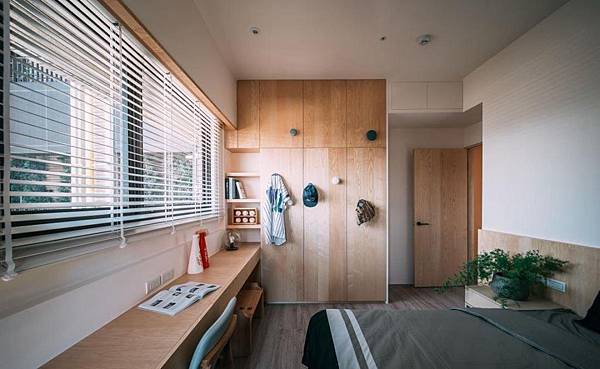 朴家大女兒朴多蕙的房間,配置並不複雜,就是書櫃、書桌以及床鋪,還有床底下的收納盒,十分對應高中女生的生活需求,而且整個空間在簡約中帶點可愛,以機能性為規劃主軸,同時還有正對庭院的大面窗,賦予空間明亮感受。