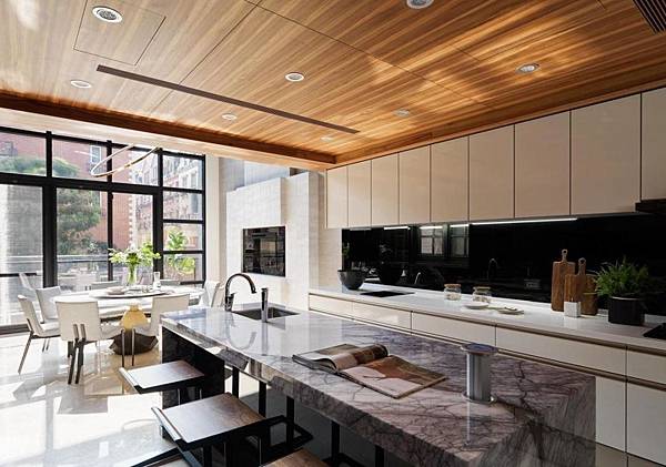 從玄關進來走上右側臺階,是《寄生上流》朴家的開放式餐廚空間,冰箱與酒櫃嵌入於餐廳旁牆面之中,保持動線的暢通,讓家人可以在此用餐聊天;再往室內深處走,則是以中島吧檯為核心的廚房區域,杯盤整齊排列,劇情裡管家都在這為朴社長一家人烹調食物,空間簡潔時尚。