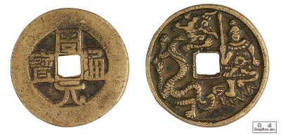 漢,建立後周。顯德二年(公元955年),世宗柴榮廢天下佛寺3336座,毀佛像鑄錢,解決了當時國中錢幣缺乏的困難。其正面錢文為“周元通寶”,沿襲“開元通寶”的形製和書體,僅改“開”為“周”,背部多鑄有星月紋等標記,同時也出現了多種圖案、大小不一的花錢,其中以龍鳳圖案較多。由于該錢系銅佛所鑄,民間傳說佩之能得神靈保佑、祛病消災,從而蒙上了一層神秘色彩,歷代累製不絕,日本也有仿製。 筆者集藏的這枚“周元通寶·降龍伏虎”花錢的特點是製作精美異常,錢文深峻如刻如鑿,書韻十足,刀工嫻熟。背面圖案是一幅完美精湛的高浮雕作品,圖的右側是一羅漢騰空而起正與蛟龍搏鬥,羅漢一手掐住龍的七寸,一手緊握龍的腹部。龍身纏繞羅漢的頭頸和全身,在作垂死掙扎。羅漢面帶勝利的微笑,神情姿態惟妙惟肖。一道電光凌空盤旋而下,製服了惡虎。整個圖案不處于同一個平面上,高低錯落有致,最高處距地張2毫米,人和動物的形體表面呈弧形凸起,富有很強的立體感。