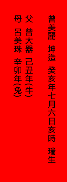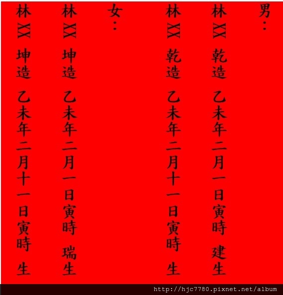答:坤(女方)xx年xx月xx日xx時(農曆用紅色紙)